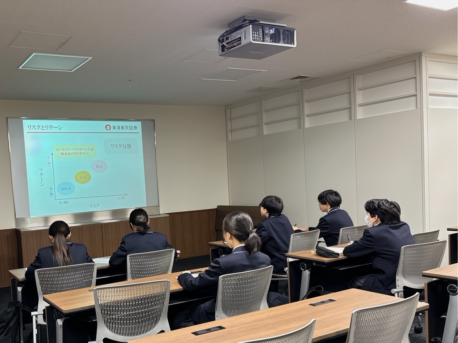 本訪問は、キャリア教育の一環として実施し、金融リテラシー向上に繋がる金融・証券業界に関する講義のほか、証券会社の仕事内容やその魅力・やりがい等についてもお伝えしました。また、支店見学のカリキュラムでは、実際に働く現場を見ていただくことで、証券会社での仕事のイメージを持ってもらう機会となりました。
